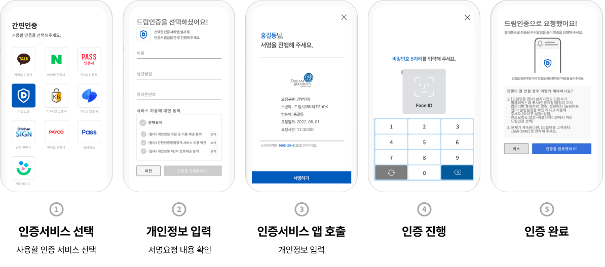 여러 간편인증 사업자와 개별적으로 신청, 계약, 정산 절차 없이 드림시큐리티와의 단일계약으로 15개 이상의 간편인증 서비스를 제공할 수 있습니다.